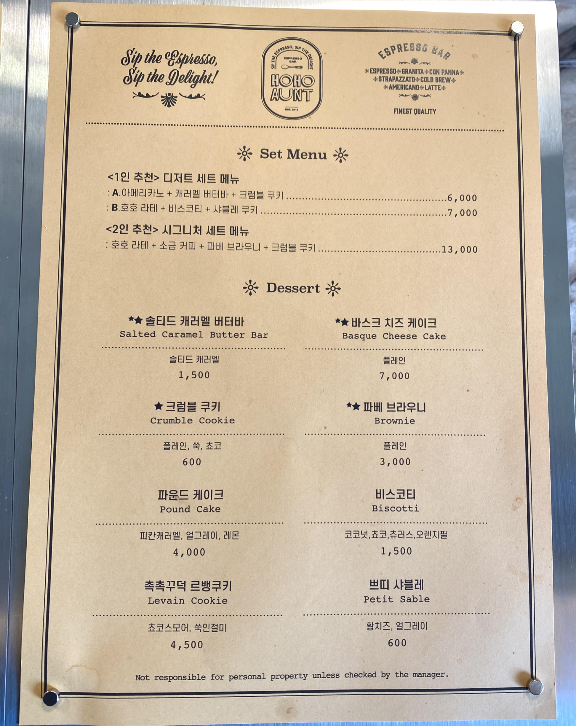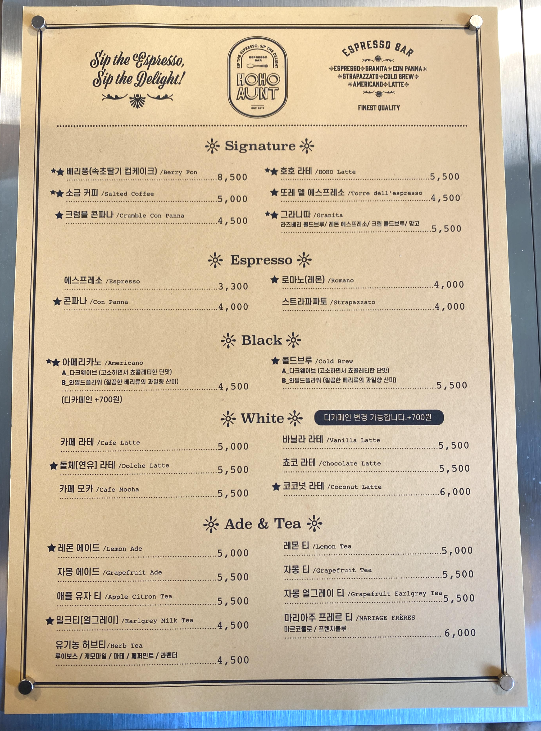 호호앤트는 커피는 물론이고 디저트, 티, 라떼까지 다양한 메뉴가 준비되어 있어요. 에스프레소바지만 다양한 메뉴 덕분에 커피 못 드시는 일행과도 함께 방문할 수 있는 카페랍니다. 호호앤트는 시그니처 커피 메뉴가 다양해요. 소금커피, 호호라떼, 에스프레소, 그라니따가 시그니처 메뉴랍니다.